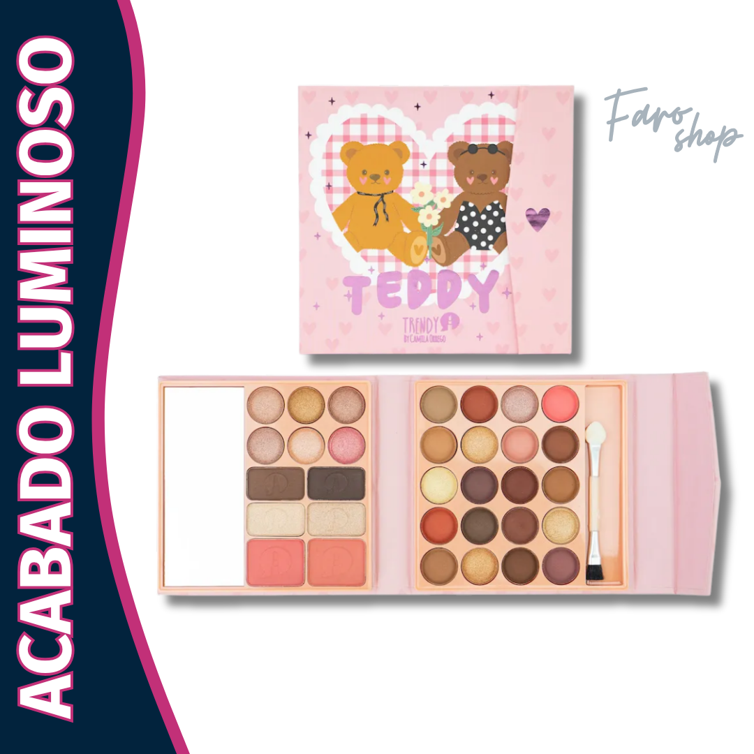 La Paleta Cartera Teddy es la paleta de rostro más adorable de Trendy 🐻. Incluye 26 sombras para ojos en tonos tierra como cafés, dorados y rosados, donde encontrarás 11 satinadas y 15 mate para crear desde looks naturales hasta maquillajes más glam. Además, trae 2 rubores mate en tonos rosados, 2 iluminadores (champaña y dorado), y 2 pigmentos para cejas, todo en un formato cartera súper práctico.